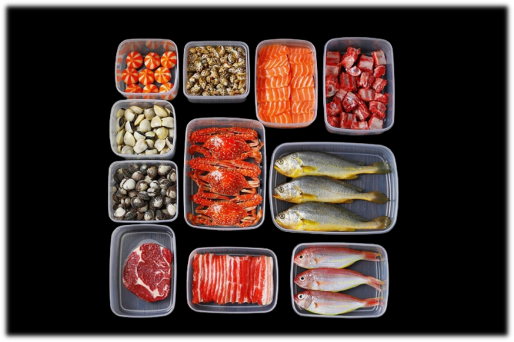 Khay nhựa đen PP đựng thực phẩm thường đóng gói các sản phẩm phổ biến như cá hấp, thịt heo, thịt gà, tôm, nước chanh dây cô đặc, các loại kem…..