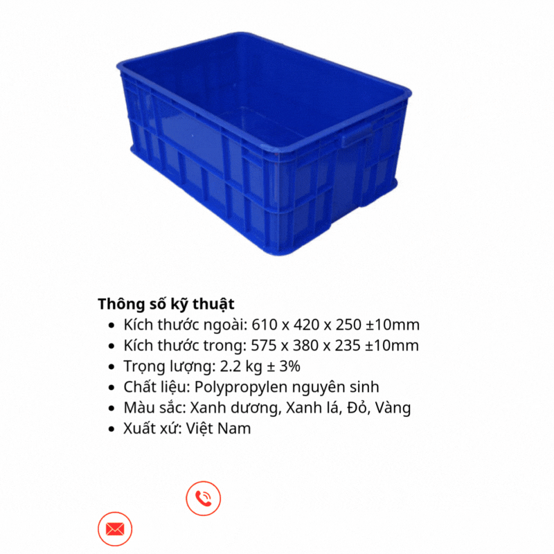 Sản xuất từ nhựa PP nguyên sinh trên dây chuyền công nghệ Nhật Bản, thùng có độ bền cao, chịu lực tốt, phù hợp chứa hàng hóa và linh kiện có tải trọng lớn.