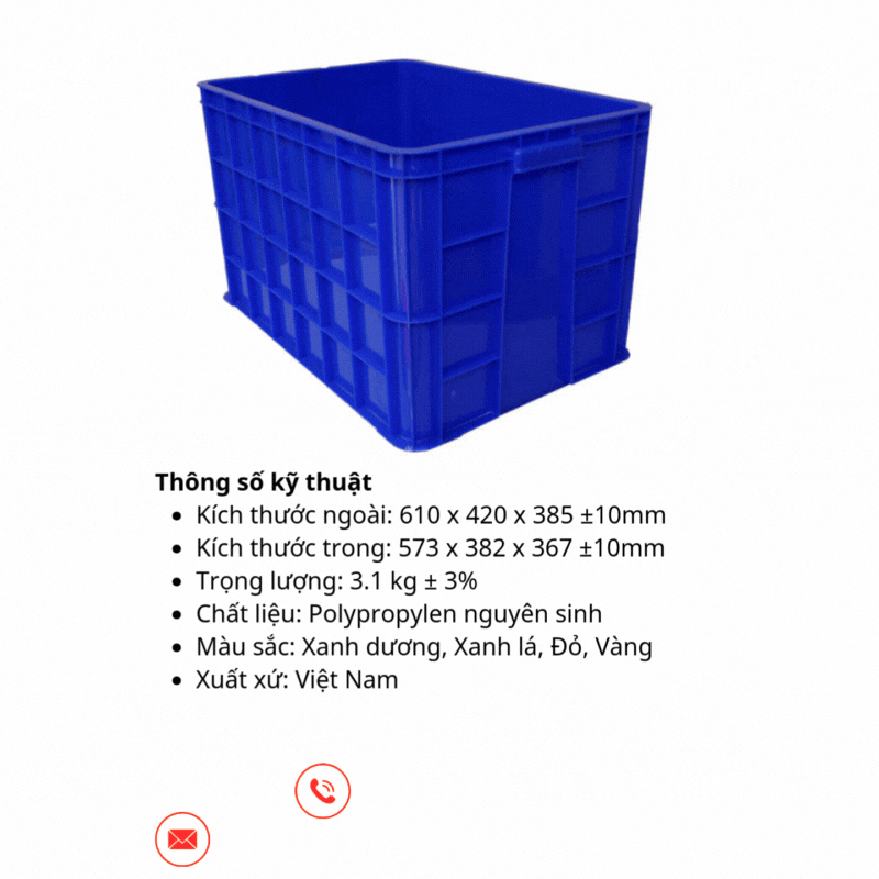 Sản xuất từ nhựa PP nguyên sinh trên dây chuyền công nghệ Nhật Bản, thùng có độ bền cao, chịu lực tốt, phù hợp chứa hàng hóa và linh kiện có tải trọng lớn.