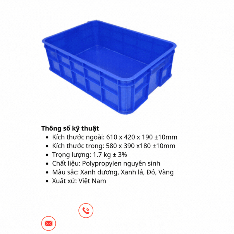 Sản xuất từ nhựa PP nguyên sinh trên dây chuyền công nghệ Nhật Bản, thùng có độ bền cao, chịu lực tốt, phù hợp chứa hàng hóa và linh kiện có tải trọng lớn.